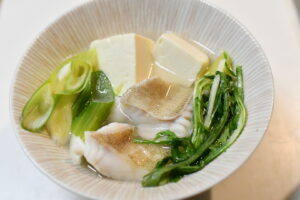 味付けは塩のみ。昆布と焼いたホウキハタのアラから出汁をとり、味を見ながら塩を少しずつ入れる。