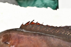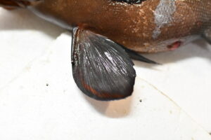 腹鰭も同様に黒く、薄い赤いラインが見える。
