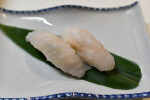 ハタ科は身が硬く、なかなかシャリに馴染まないことも多いのだが、本種は包み込むよう柔らかさと、シャリと溶け合うような甘みが感じられる。