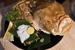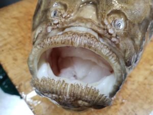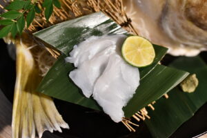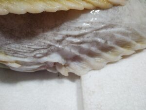 身の質は脱水をしていないオオカミウオのような質感で、コリッとしたような弾力はないが、繊維がしっかりしていて多少噛まないと咀嚼できないような、質のいい白身である。