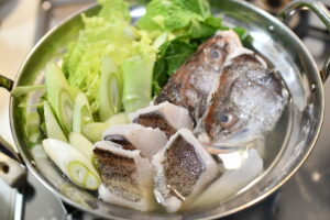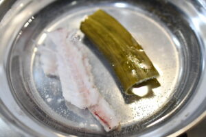 ヨロイイタチウオのあら骨と昆布で出汁をとり、生姜を溶いた汁に白菜、ネギ、ヨロイイタチウオを入れる。